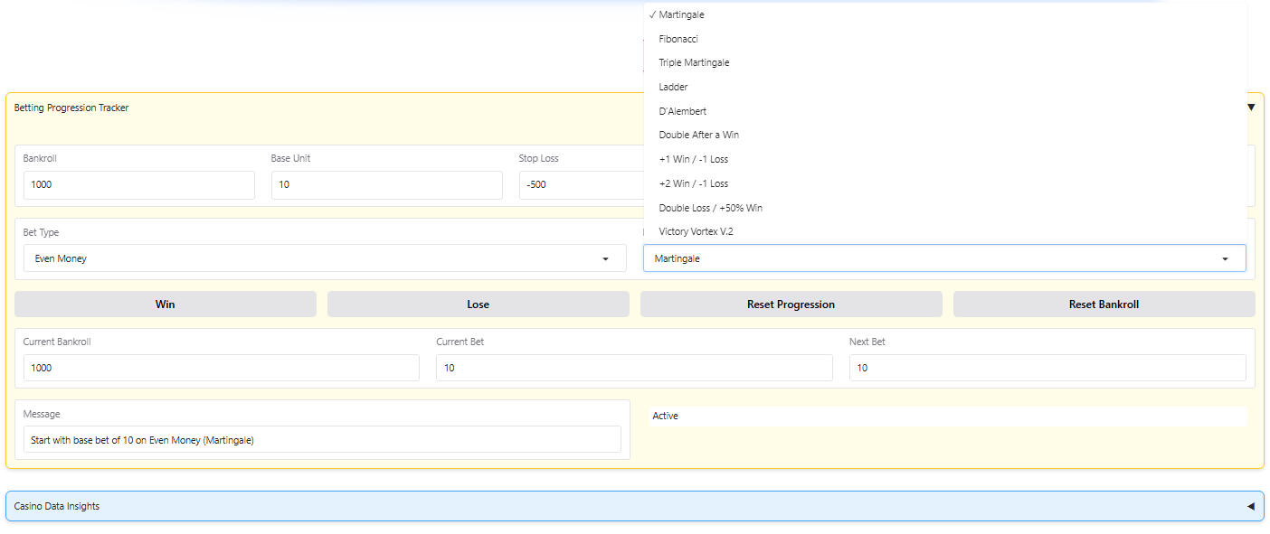 Simulate betting progressions to learn how different systems impact your bankroll.