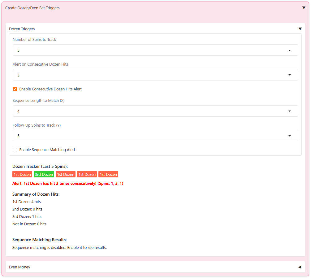 Take control of your roulette analysis with custom alerts for dozen and even-money bet patterns. Set triggers to track consecutive dozen hits or specific even-money sequences (e.g., Red/Black, Even/Odd), empowering you to study trends and deepen your understanding of roulette dynamics in a risk-free environment.